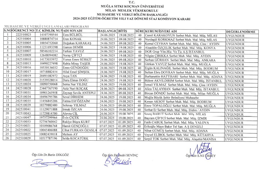 Staj işlemleri 2024-2025 Egitim Öğretim Yılı Yaz Dönemi staj yapmak için başvuran öğrencilerin değerlendirme sonuçları,